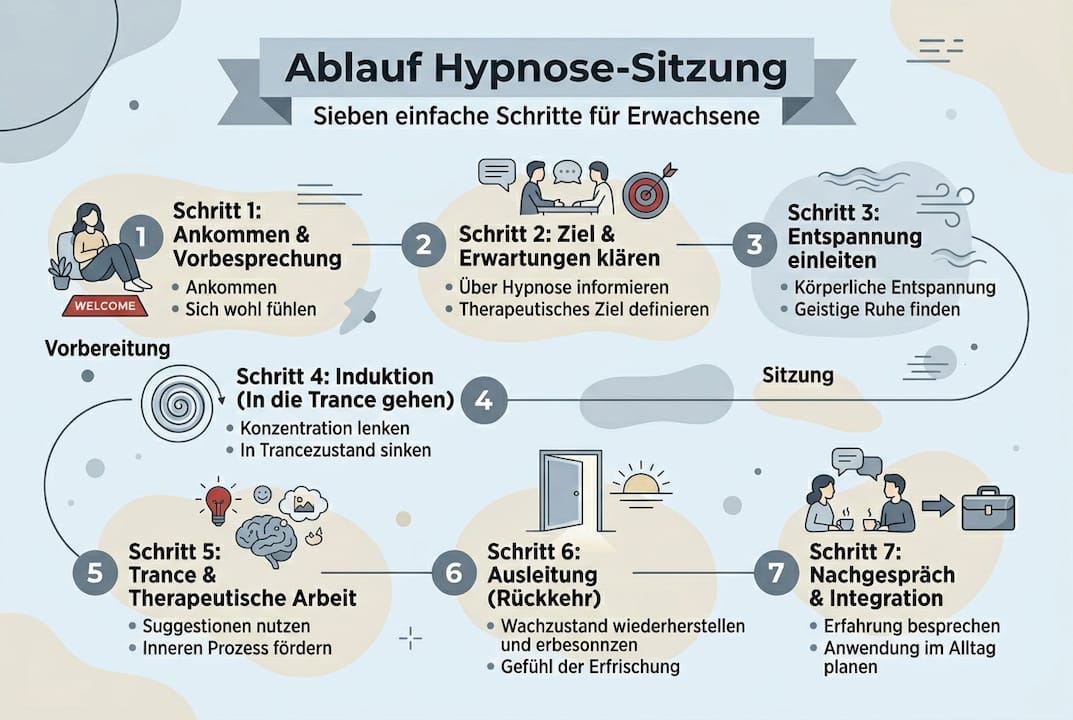 | Klarer Ablauf | Eine Hypnose-Sitzung folgt typischerweise sieben strukturierten Schritten für maximale Transparenz. |