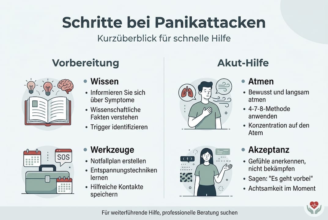 Plötzlich schlägt das Herz wie wild, die Luft bleibt weg, und ein Gefühl der totalen Hilflosigkeit überwältigt Sie. Panikattacken treffen Betroffene oft ohne Vorwarnung und fühlen sich lebensbedrohlich an, obwohl sie es nicht sind. Panikstörung betrifft bis zu 15% der Menschen in Deutschland über das Leben hinweg. Die gute Nachricht: Es gibt bewährte, praxiserprobte Strategien, die Ihnen helfen, Kontrolle zurückzugewinnen. Dieser Leitfaden erklärt Schritt für Schritt, was in Ihrem Körper passiert, wie Sie sich vorbereiten und was Sie im Akutfall konkret tun können.