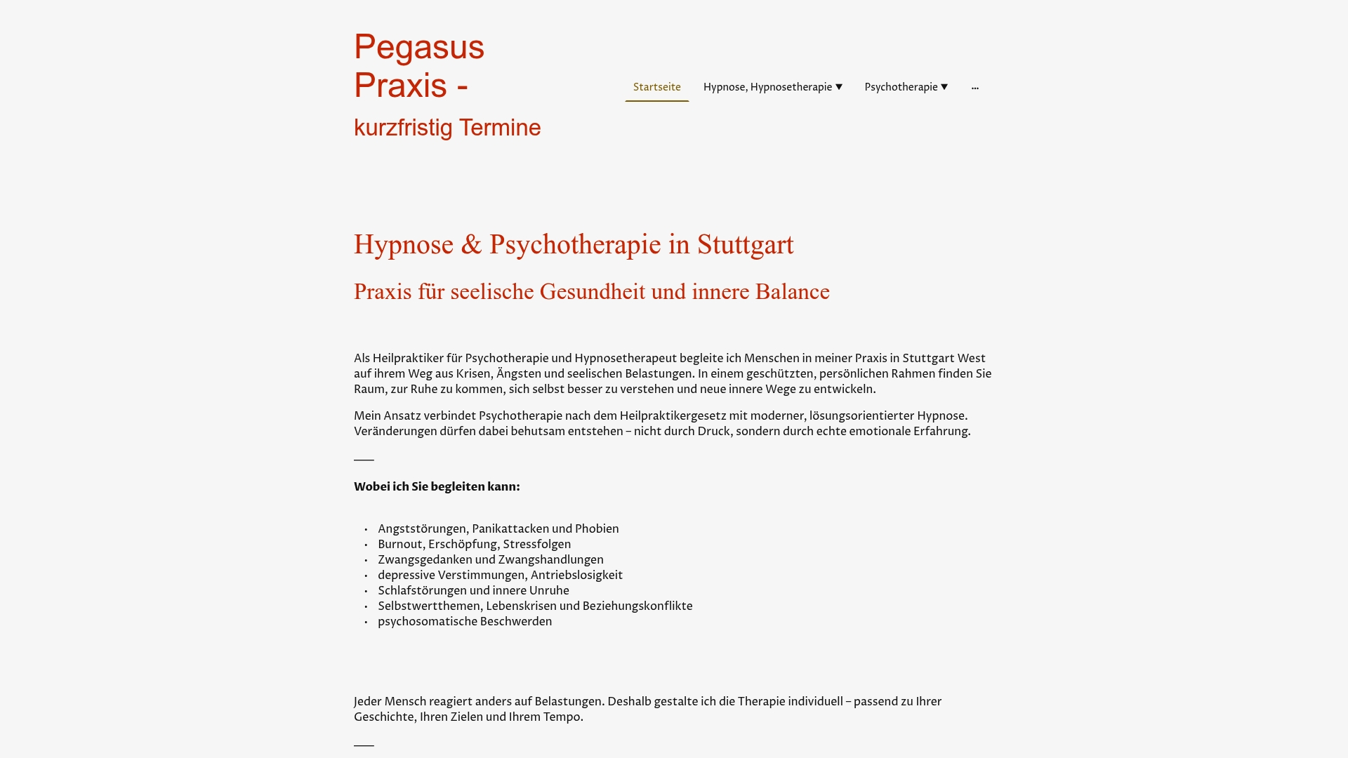 | Pegasus Praxis, Stuttgart | Hypnose & Psychotherapie für Erwachsene | Individuelle Ansätze, schnelle Verfügbarkeit. | Keine Preistransparenz auf der Website. | Preise auf Anfrage. |