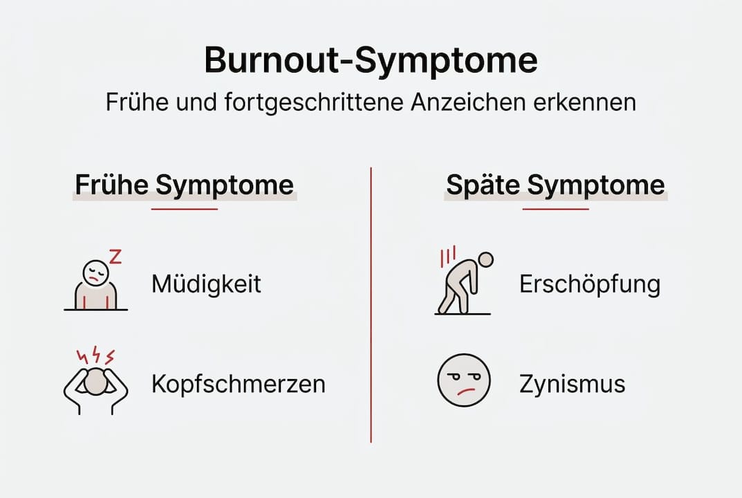 - Frühe Warnzeichen sind anhaltende Erschöpfung und Gleichgültigkeit gegenüber der Arbeit.